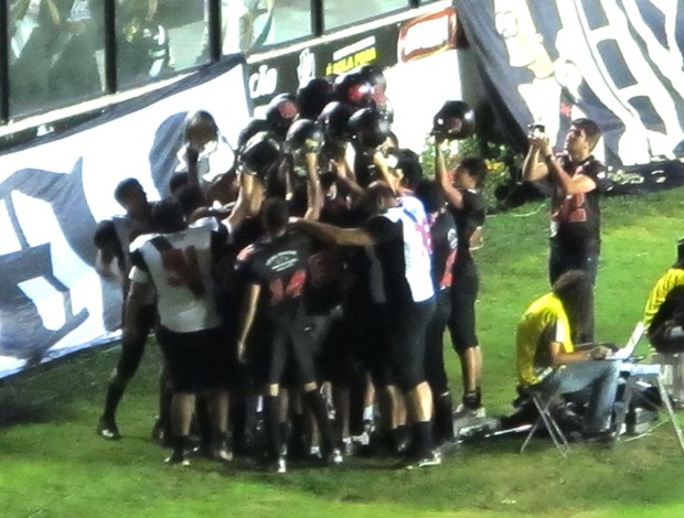 Nem mesmo no intervalo da partida contra o Vitória, o Vasco deixou de mostrar futebol. Mas o americano. Os jogadores do Vasco Patriotas fizeram uma exibição no gramado de São Januário, na noite desta quarta-feira, para promover a equipe que lidera seu grupo no Torneio Touchdown.