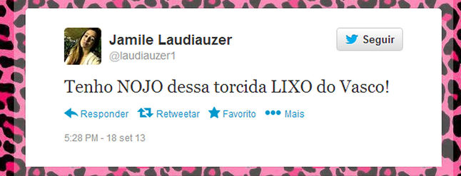 Após a derrota desta quarta-feira para o Vitória, o clima ficou pesado em São Januário. Alvo de críticas de torcedores vascaínos em seu Twitter, a namorada de Rodrigo Dinamite, filho do presidente Roberto Dinamite, Jamile Laudiauzer, disse que tem nojo da torcida do Vasco e chegou a usar palavras de baixo calão para defender o mandatário.