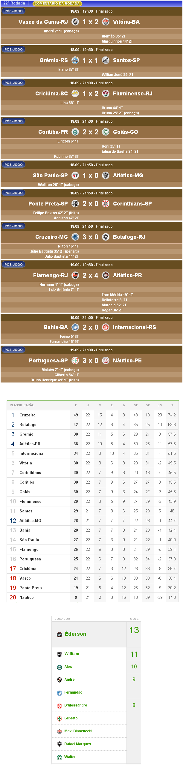 Terminada a 22ª rodada do Campeonato Brasileiro, a 3ª do returno, o Vasco, que perdeu para o Vitória por 3 a 1, caiu da 17ª para a 18ª colocação na tabela, seguindo na zona do rebaixamento.