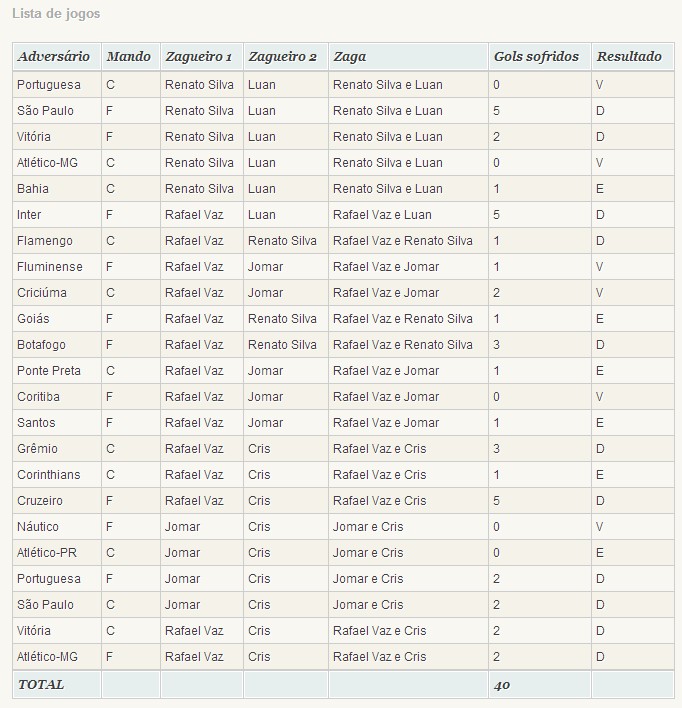 Com 40 gols sofridos no campeonato brasileiro, o Vasco tem, ao lado do Náutico, a defesa mais vazada do campeonato. Dona do sexto melhor ataque da competição, a equipe cruzmaltina tem enfrentado problemas para encontrar um equilíbrio entre o bom desempenho ofensivo e o péssimo desempenho defensivo. FutDados busca, neste post, trazer números específicos referentes à zaga cruzmaltina (desempenho de duplas e desempenho individual). Tal abordagem, evidentemente, restringe-se aos números dos jogadores deste setor, sem ter nenhuma pretensão de analisar de forma mais profunda os outros problemas táticos e técnicos que contribuem para o mau desempenho defensivo de uma equipe.