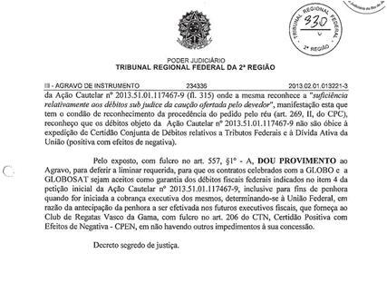 Como esperado há muito tempo, o Vasco finalmente consegue as Certidões Negativas de Débitos. A Desembargadora do TRF 2ª Região deferiu o Agravo de Instrumento do Vasco e autorizou a expedição das CND’s, com isso o clube deve respirar aliviado por alguns meses.