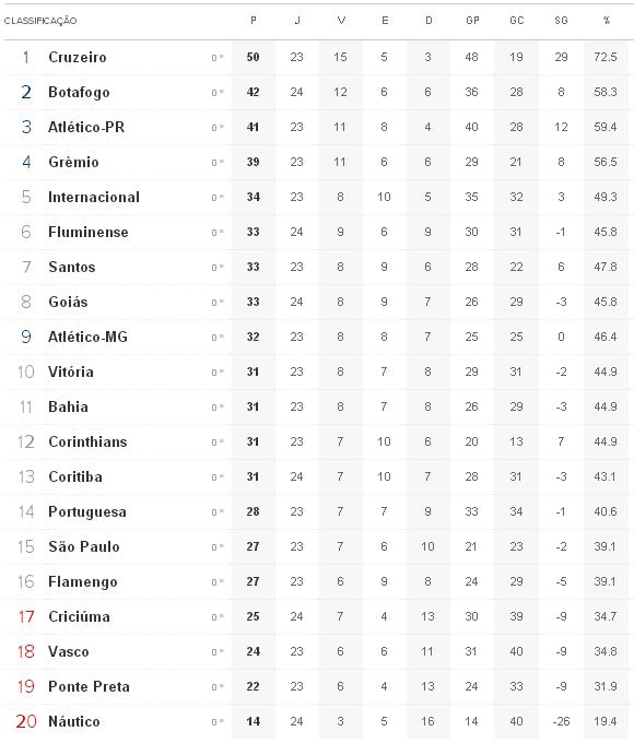 Os resultados de sábado (28/09) não foram bons para o Vasco, uma vez que os times que estão na zona do rebaixamento venceram suas partidas. O Náutico, jogando em casa, fez 3 a 0 no Coritiba; já a Ponte Preta venceu o Botafogo por 1 a 0 no Maracanã e chegou a 22 pontos, dois a menos do Vasco. No outro resultado do dia, o Fluminense derrotou o Goiás fora de casa por 2 a 1.