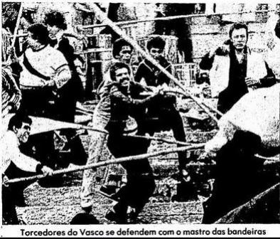 CORTE: Um torcedor, com um bambu que minutos atrás era mastro de bandeira, atinge a cabeça de um torcedor com a camisa do Vasco.