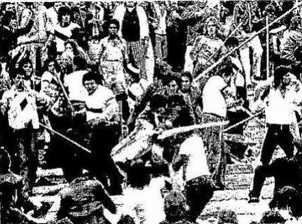CORTE: Zoom aproximando a Torcida. Nas arquibancadas, comprimidos pela enorme massa gremista, o reduzido número de torcedores do Vasco está sendo agredido. Garrafadas, pedradas, mastros de bandeiras transformados em porretes.
