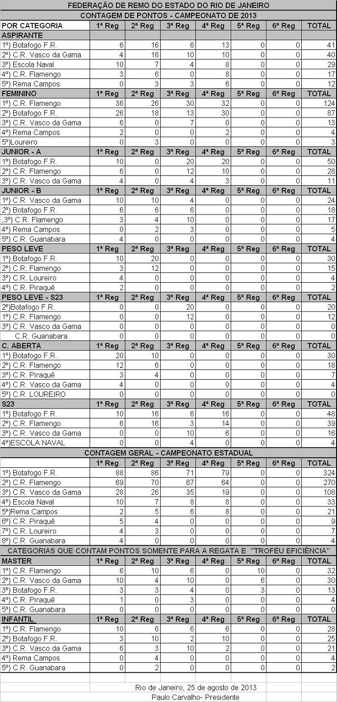 Foi aprovada, pela Comissão de Arbitragem, a 4ª REGATA DO CAMPEONATO ESTADUAL, realizada no dia 25 de agosto de 2013, na Lagoa Rodrigo de Freitas cujo o resultado foi o seguinte: