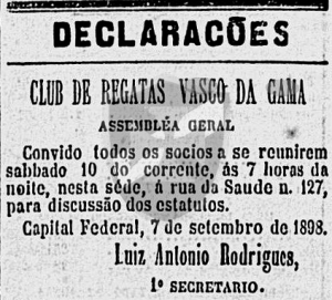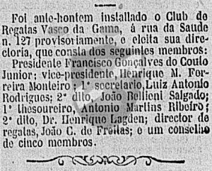 (1) Vide em A PRIMEIRA DIRETORIA DO VASCO - Há exatos 115 anos, foi instalado o club e tomava posse sua primeira diretoria.