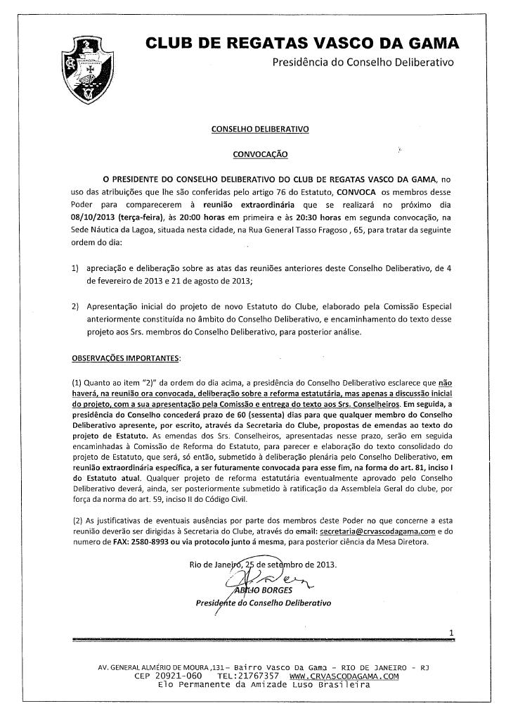 Apresentação inicial do projeto do novo Estatuto ao Conselho Deliberativo será no dia 08/10; veja a convocação da reunião