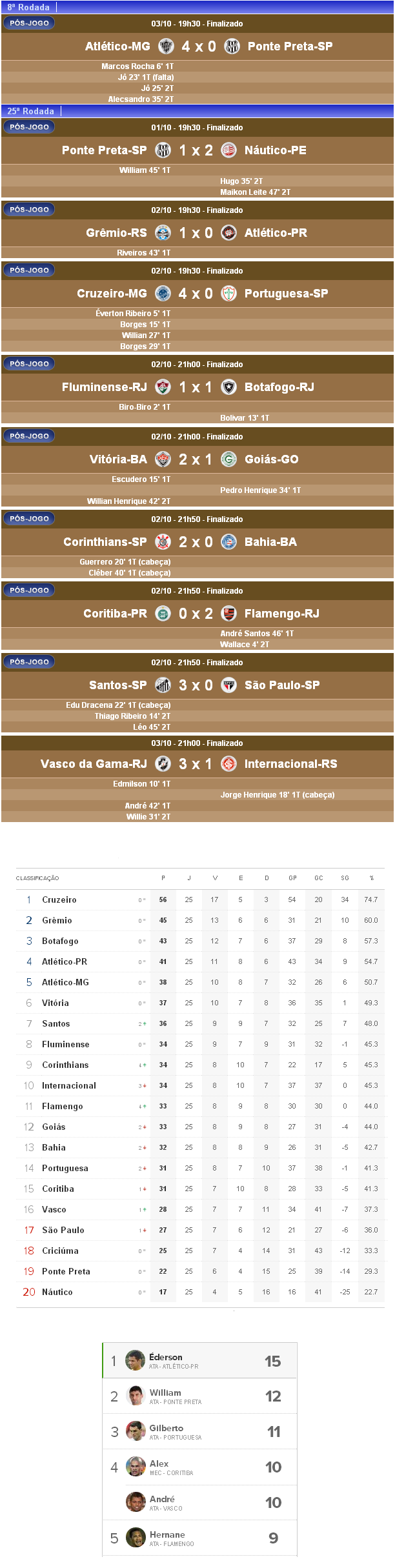 Terminada a 25ª rodada do Campeonato Brasileiro, a 6ª do returno, o Vasco, que derrotou o Internacional por 3 a 1, subiu da 18ª para a 16ª colocação na tabela, deixando a zona do rebaixamento.