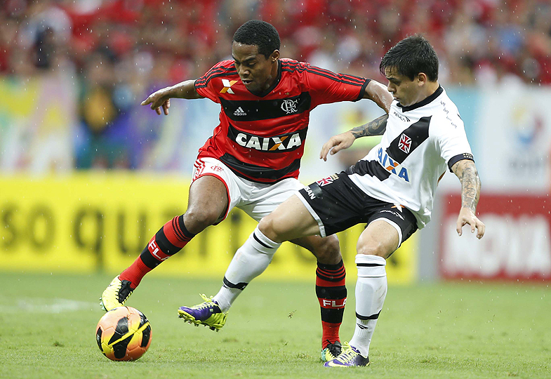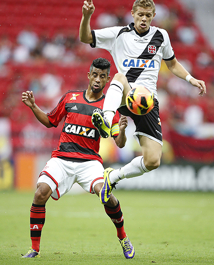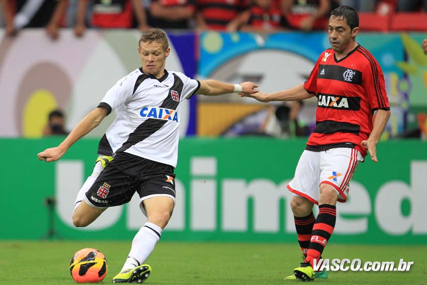 O que mais se viu no primeiro tempo foi nervosismo e uma rivalidade à flor da pele no Clássico dos Millhões, ainda que longe do Maracanã. O meio-campo todo brigava pela bola, com destaque para Amaral, do lado rubro-negro, e Pedro Ken, do vascaíno. E é bom abrir dois parênteses nessas trocas de "gentilezas": o zagueiro Wallace, destaque na vitória do Fla sobre o Criciúma, poderia ter saído de campo expulso. E não o foi porque o árbitro não lhe aplicou cartão amarelo quando pôs intencionalmente a mão na bola no começo da partida. Depois, o ganhou num lance em que deu um tapa em Fágner quando já tinha vantagem no lance. E o mesmo pode se dizer de Juninho. O Príncipe - até ele - estava tenso, a ponto de ter solado o joelho de Paulinho. O amarelo também saiu barato.