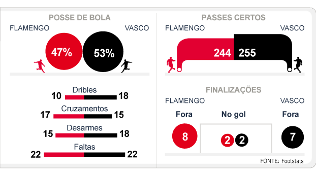 Não adiantou muito. O Vasco passou a mandar na partida. Pedro Ken roubava todas as bolas no meio-campo. Marlone, Jhon Cley e Willie voavam no ataque. E pelo lado de Léo Moura saíam as melhores jogadas. Numa delas Yotún desperdiçou por ter tentado bater em vez de cruzar. Curiosamente, Dorival Junior trocou Jhon Cley, bem na partida, por Wendel. O Fla esboçou reação no fim, mas o empate fez mais justiça a um jogo com pouca inspiração.