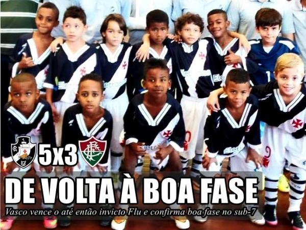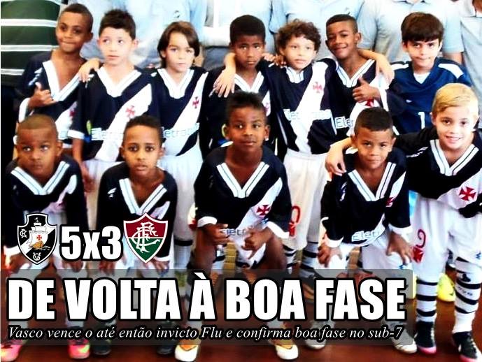 Na manhã deste sábado (05/10), no ginásio do Grajaú Country Club, a criançada vascaína da categoria sub-7 (chupetinha) do futsal mostrou a sua força e quebrou a invencibilidade do líder Fluminense ao vencê-lo por 5 a 3, pelo Campeonato Estadual. Os vascaínos retomam a boa fase após um mau começo na competição, com derrota para o Tricolor na estreia por 11 a 7 e empate com a AABB-Rio/K-Esportes/Marã, e emendam duas vitórias em clássicos: no sábado passado, havia vencido a Casa de España/Botafogo por assustadores 11 a 1.