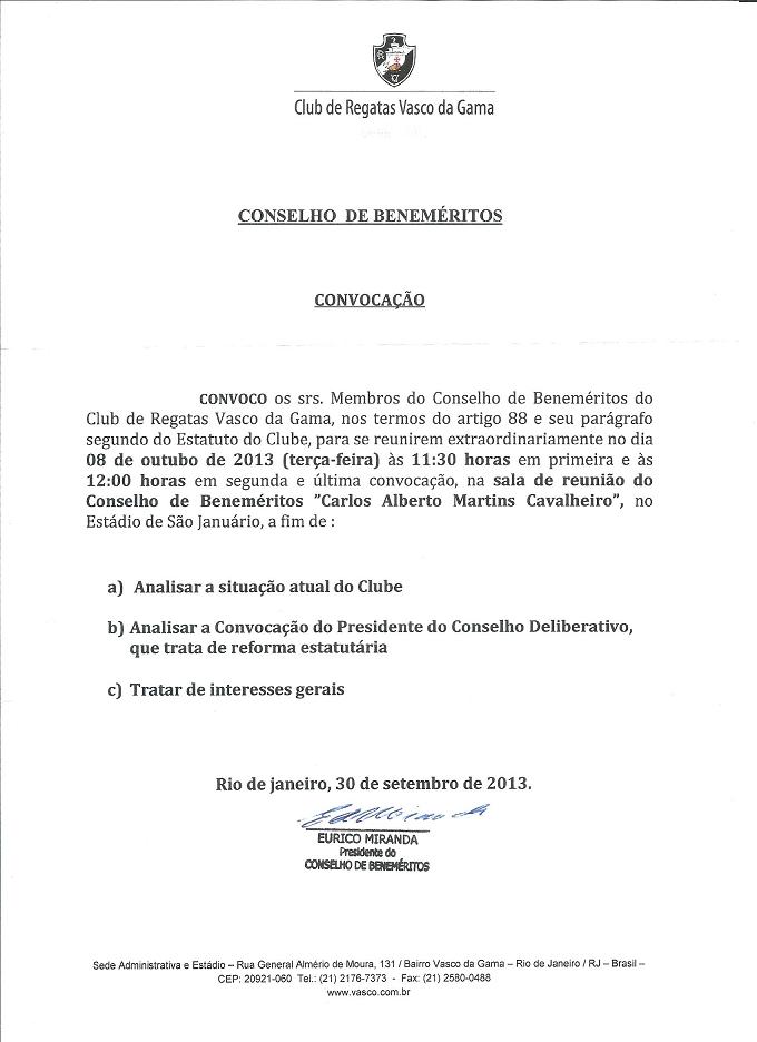- 08/04/13Eurico Miranda convoca reunião do Conselho de Beneméritos para 15/04