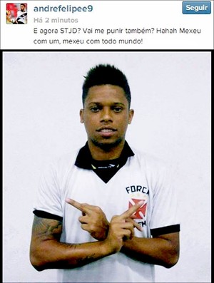 A possível punição do Superior Tribunal de Justiça Desportiva (STJD) a Juninho, que fez o tradicional gesto da principal organizada do Vasco para a arquibancada no clássico com o Flamengo, no domingo, em Brasília, está mexendo com os vascaínos nas redes sociais. O Facebook oficial desta facção da torcida cruz-maltina reproduziu um post que seria do Instagram de André, no qual o atacante repete o gesto obsceno feito pelo Reizinho e ainda provoca o Tribunal. No entanto, o jogador informou, através da assessoria de imprensa do clube, que o post no Instagram é uma montagem. André fez o gesto durante entrevista para o site oficial da organizada, porém o atacante afirma que jamais postou a provocação ao STJD.