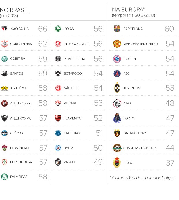 Os campeões das dez principais ligas europeias tiveram uma média de 50 jogos em 2012/2013. Os clubes brasileiros da Série A, mais o Palmeiras, têm média de 55 partidas até agora no ano, faltando dois meses para o fim da temporada. Alguns grandes clubes do Velho Continente destoaram desta média, como o Chelsea, que terminou com 69 jogos. O Wigan é um dos únicos no futebol europeu que pode atingir um 'nível brasileiro'.