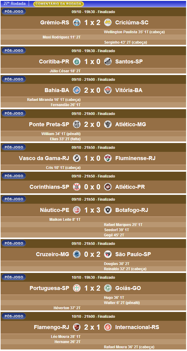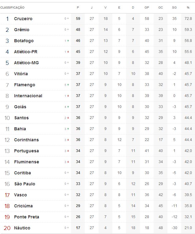 Terminada a 27ª rodada do Campeonato Brasileiro, a 8ª do returno, o Vasco, que venceu o Fluminense por 1 a 0, continuou na 17ª colocação na tabela, dentro da zona do rebaixamento.