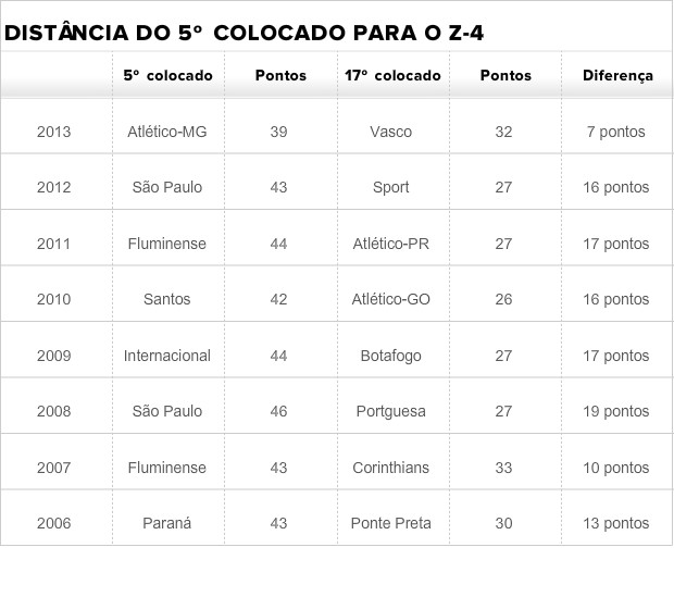 Até agora, o ano em que o quinto colocado esteve mais próximo da zona de rebaixamento a esta altura da competição foi em 2007, quando o Fluminense somava 43 pontos, dez acima do Corinthians, o primeiro na degola. No outro extremo, a maior vantagem aconteceu no ano seguinte, com 19 pontos: o São Paulo tinha 46, contra 27 da Portuguesa.