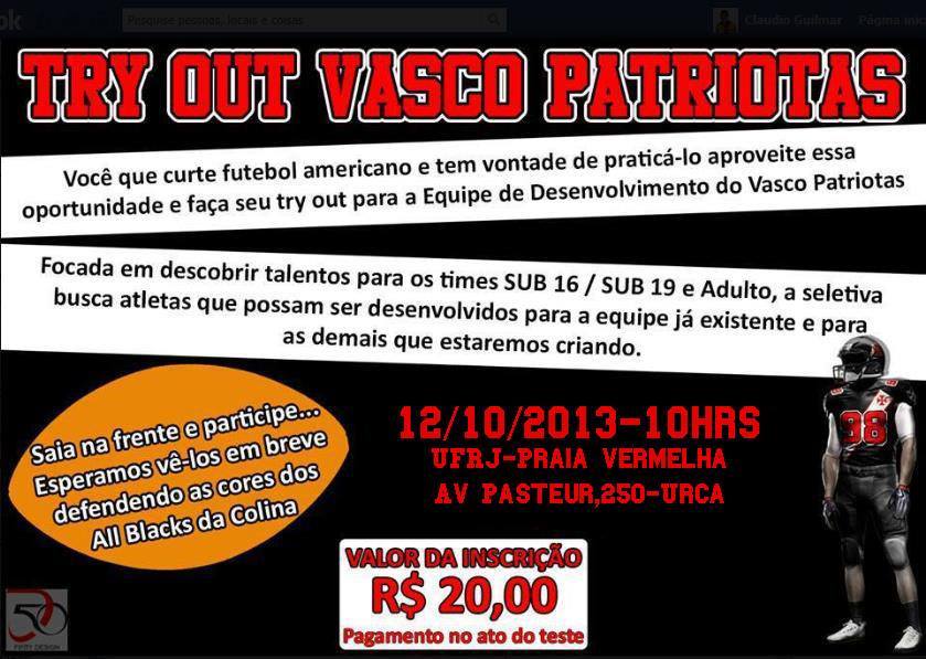 O time de futebol americano vascaíno, Vasco da Gama Patriotas, vai realizar amanhã, no campo da UFRj, na Praia Vermelha, ás 10 horas, uma seletiva. O objetivo é buscar novos atletas no mercado, através do try out, com a equipe de desenvolvimento do Vasco.