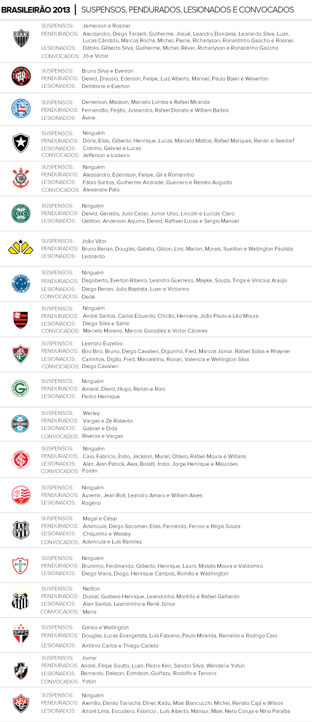 O Brasileirão caminha para sua reta final, e a 28ª rodada começa neste sábado, às 18h30m (de Brasília), com dois jogos: Fluminense x Grêmio e Vitória x Goiás. Como o fim de semana é de definições para as seleções que disputam as Eliminatórias da América do Sul para Copa do Mundo de 2014, além dos desfalques lesões e suspensões, algumas equipes não poderão contar com os jogadores convocados. Por isso é bom conferir a lista completa para saber quem não entra em campo e também para não marcar bobeira no Cartola FC. O mercado do fantasy game fecha às 16h30m, duas horas antes do início das partidas.
