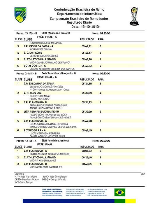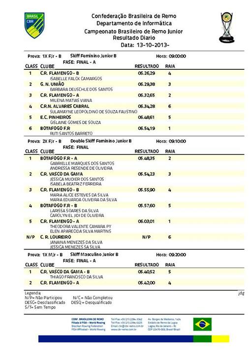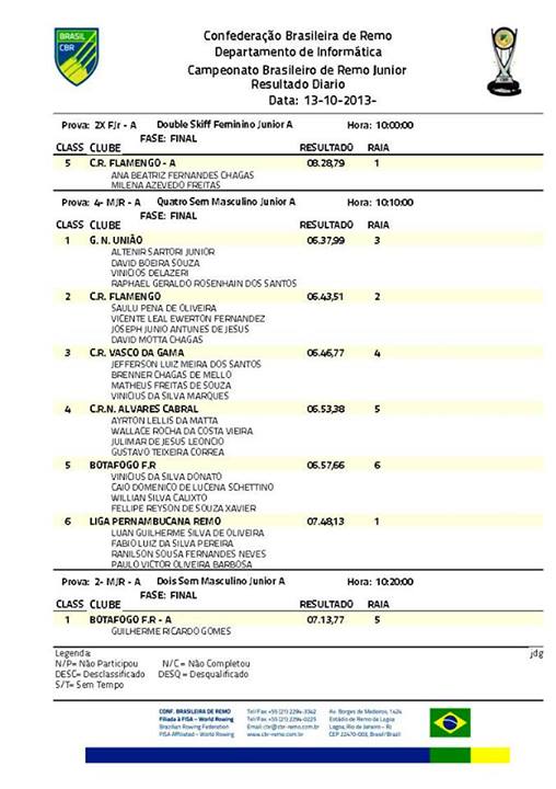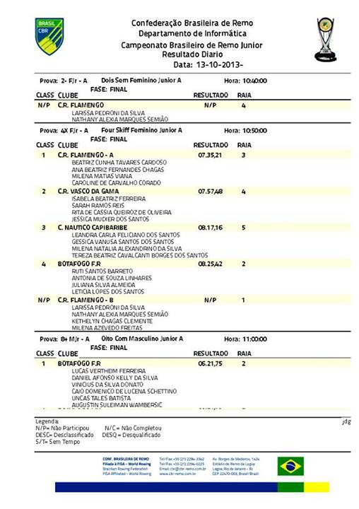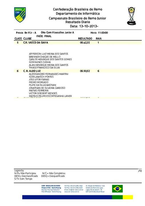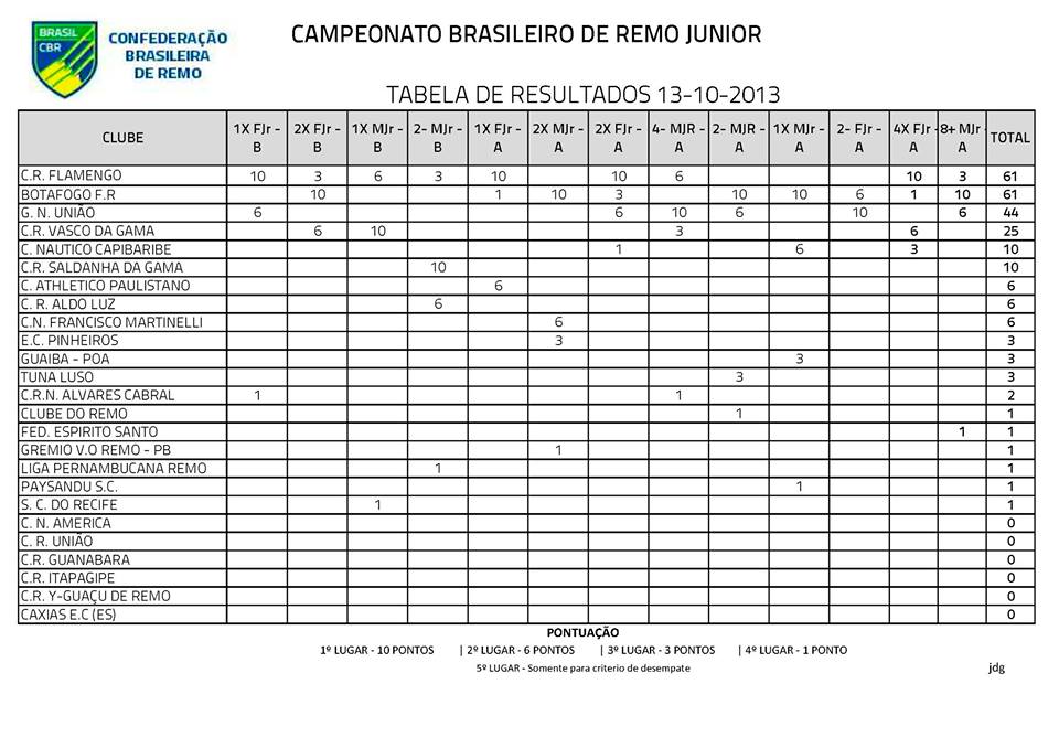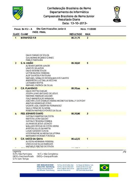 Com 24 pontos, o Vasco terminou o Campeonato Brasileiro Júnior de Remo na 4ª colocação. A competição foi disputada neste fim de semana no Estádio de Remo da Lagoa, no Rio de Janeiro. O título ficou com o Flamengo e o Botafogo foi o vice-campeão. Confira, abaixo, os resultados das finais com participação vascaína e a classificação final.