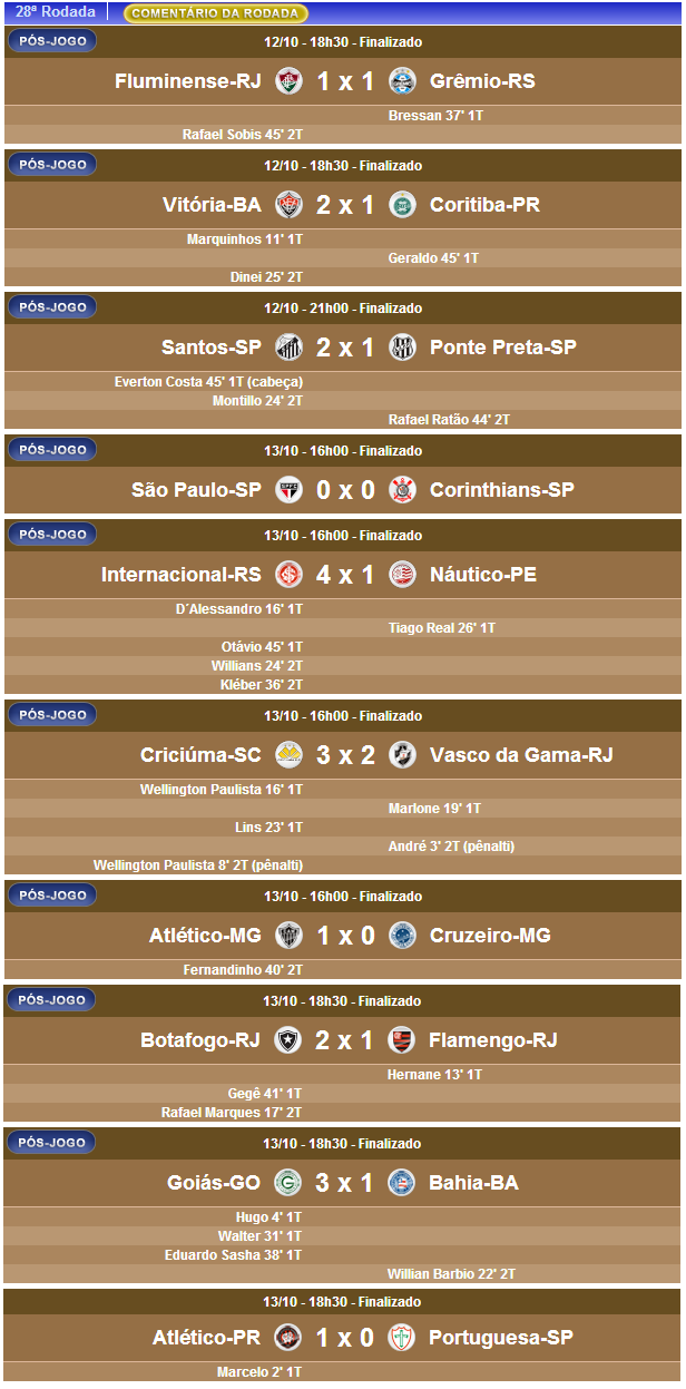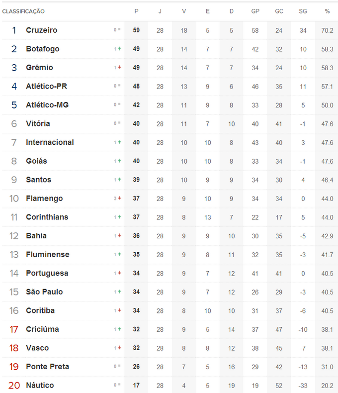 Terminada a 28ª rodada do Campeonato Brasileiro, a 9ª do returno, o Vasco, que perdeu para o Criciúma por 3 a 2, caiu da 17ª para a 18ª colocação na tabela, continuando na zona do rebaixamento.