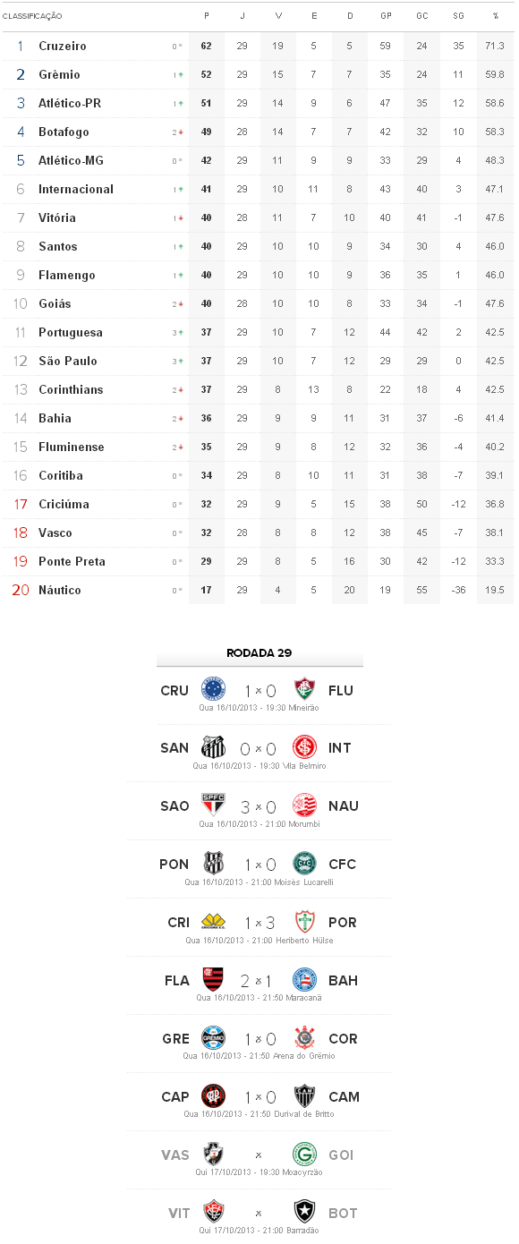 As derrotas de Criciúma e Coritiba na noite desta 4ª-feira (16/10) deixaram o Vasco a uma vitória de sair da zona do rebaixamento. Tudo que o Gigante da Colina precisa fazer é derrotar o Goiás por qualquer placar na noite desta 5ª-feira (17/10) no Moacyrzão, em Macaé. Se vencer por 3 ou mais gols de diferença, ultrapassa também o Fluminense e termina a rodada na 15ª posição.