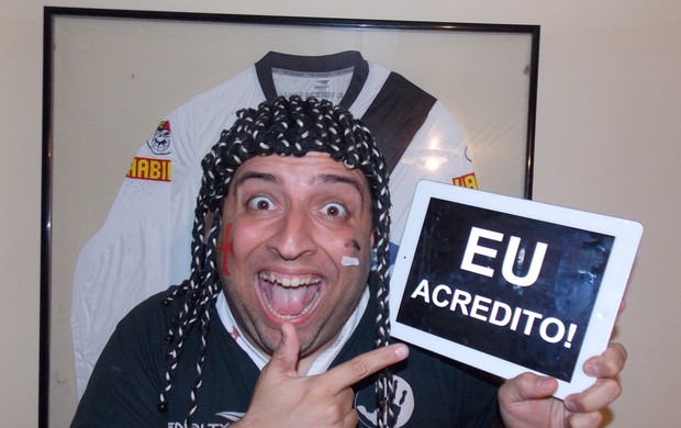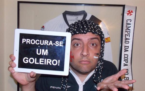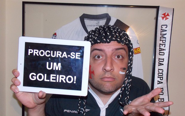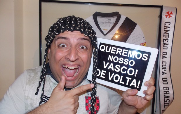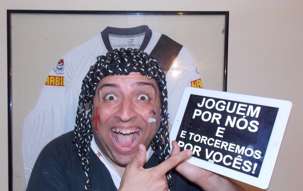 Figura carimbada nos jogos do Vasco, o folclórico 'Homem Piruca' (sic) não tem dormido bem. O risco de rebaixamento é grande, assim como a agonia de não conseguir ver o time reagir. Faltando oito jogos para o fim do Brasileirão, o empresário Carlos Alexandre Vilela dos Santos, de 32 anos, fez um novo ensaio de protestos usando o seu inseparável tablet - a exemplo do que fez aqui no blog em março. Mais uma vez o tom é de críticas e apoio ao time. A fase é tão complicada que, dias atrás, o torcedor quase perdeu a sua peruca. Ninguém da família conseguia encontrá-la em casa. Mas pelo menos essa agonia acabou horas depois, com a peruca de estimação na cabeça.