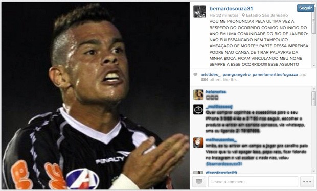 - Vou me pronunciar pela última vez a respeito do ocorrido comigo no início do ano em uma comunidade do Rio de Janeiro: não fui espancado nem tampouco ameaçado de morte!!! Parte dessa imprensa podre não cansa de tirar palavras da minha boca, ficam vinculando meu nome sempre a esse ocorrido!!! Esse assunto morreu na minha, acabou!!! Esqueçam esse assunto!!!! Gostaria ainda de informar a quem quer que seja: não me pronuncio mais sobre esse ocorrido, me recusarei a qualquer pessoa!!!! Espero ter sido objetivo e transparente!!!! - escreveu o jogador, recebendo apoio dos torcedores na internet e usando palavrão em hashtags, como "#nãoentendeu?fo***"
