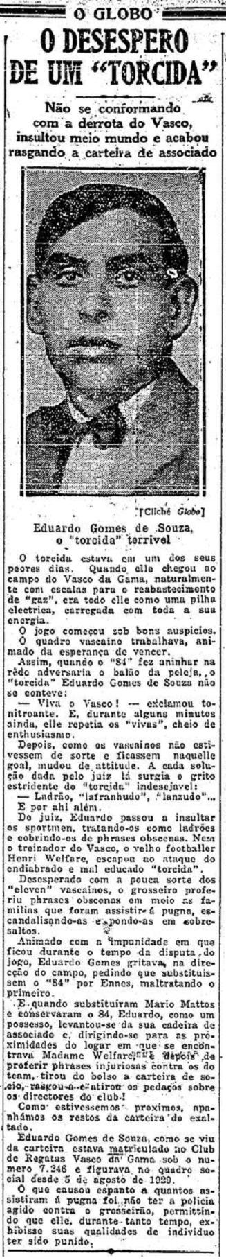 Em 8 de junho de 1930, o Vasco foi derrotado por 2 a 1 pelo Botafogo em São Januário, em jogo válido pelo Campeonato Carioca. Foi a primeira derrota vascaína dentro de casa para o Alvinegro em todos os tempos (saiba mais clicando aqui). O jornal O Globo do dia seguinte relata o desespero de um torcedor (na época chamado de "torcida") com a atuação do time, de alguns jogadores e do árbitro. Após uma substituição que o desagradou, o torcedor chegou até mesmo a rasgar sua carteirinha de sócio do Vasco. Xingamentos não eram comuns nos estádios naquela época, daí a indignação do jornal.