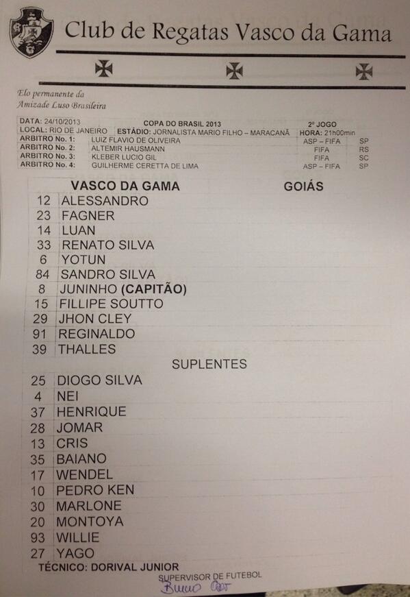 Confira escalação oficial do Vasco; Alessandro no gol e Juninho titular