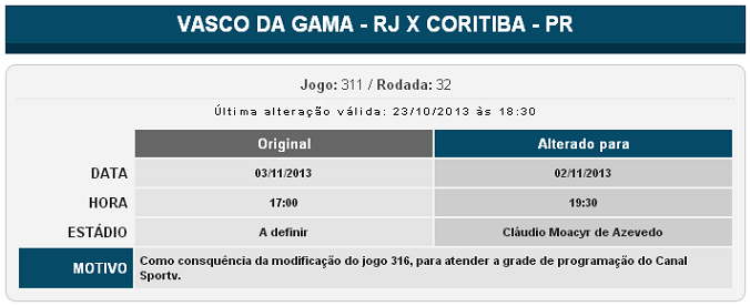 Sportv pede e CBF antecipa Vasco x Coritiba de 03/11 às 17h para 02/11 às 19h30