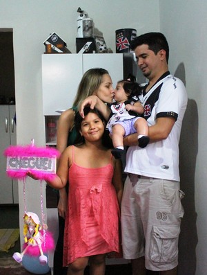 E não foi só na casa onde mora e na parte financeira que o Vasco influenciou na vida do Dimas. Há oito anos, ele conheceu a então torcedora do São Paulo, Rafaela Vasconcelos. É isso mesmo. A hoje vascaína e esposa do agente penitenciário tem o nome do Vasco no sobrenome. O mesmo aconteceu com as duas filhas do casal: Antônia Manuela Vasconcelos, de oito anos e Rebeca Vasconcelos, de apenas cinco meses.