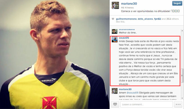 A difícil situação do Vasco tem comovido ex-jogadores do clube. Criado nas categorias de base do Cruz-Maltino, o volante Souza, hoje no Grêmio, mandou uma mensagem de apoio ao meia Marlone no Instagram: