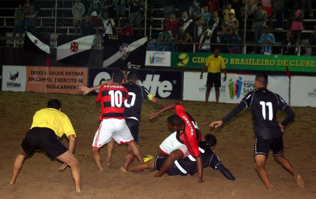 O Vasco da Gama é o primeiro time do Grupo A que avançou para as semifinais da 1ª etapa do Circuito Brasileiro de Clubes de futebol de areia, que acontece na arena montada na Praia de Camburi, em Vitória, no Espírito Santo. A classificação veio com a vitória por 3 a 2 sobre o Flamengo, no clássico da segunda rodada da competição nacional, que aconteceu na noite desta quinta-feira. A nota triste da partida fica por conta do confronto entre torcedores das duas equipes, durante a partida, que ficou paralisada por cerca de 10 minutos. Munidos de fogos de artifício, integrantes de torcidas das duas equipes se atacaram nas arquibancadas, mas no entorno da arena, foram contidos pela Polícia Militar do ES.