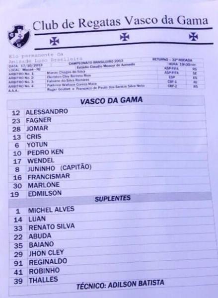 Confira escalação oficial do Vasco para o jogo contra o Coritiba