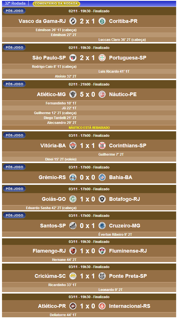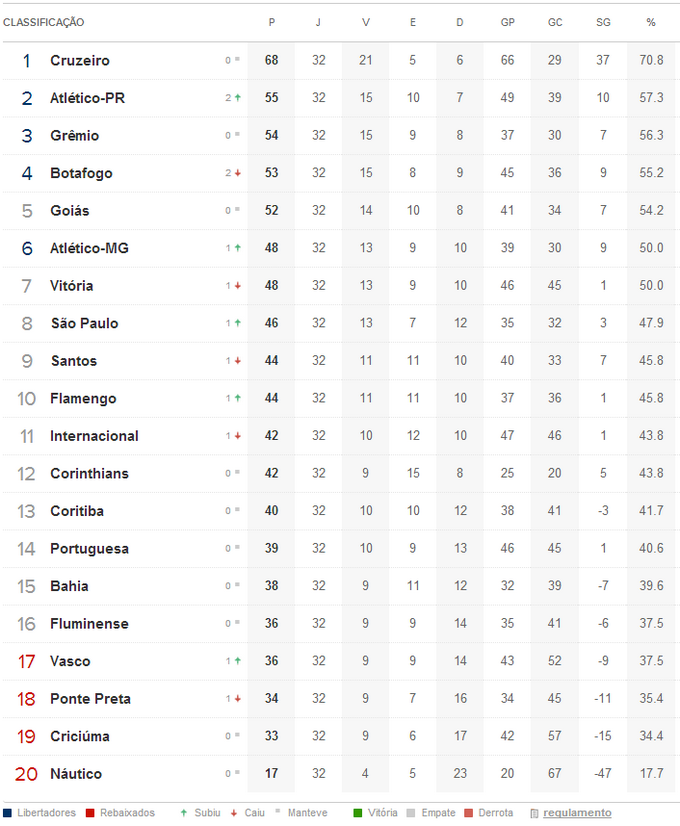 Terminada a 32ª rodada do Campeonato Brasileiro, a 13ª do returno, o Vasco, que venceu o Coritiba por 2 a 1, subiu da 18ª para a 17ª colocação na tabela, continuando na zona do rebaixamento. O Vasco está com o mesmo número de pontos, mesmo número de vitórias e 3 gols de saldo atrás do último clube fora do Z4, que é o Fluminense.