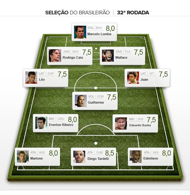Com participações importantes, quatro jogadores conquistaram a nota 8,0. A começar pelo goleiro Marcelo Lomba, decisivo para um empate em 0 a 0 contra o Grêmio em plena Arena, no Rio Grande do Sul, com cinco grandes defesas. Éverton Ribeiro marcou um golaço e garantiu a vitória do Cruzeiro fora de casa sobre o Santos, deixando a equipe a uma vitória do título nacional de 2013. E, para completar, a dupla Marlone e Edmílson foi heroica no triunfo do Vasco sobre o Coritiba, que rendeu três pontos importantes na luta contra o rebaixamento, na estreia do técnico Adílson Batista.