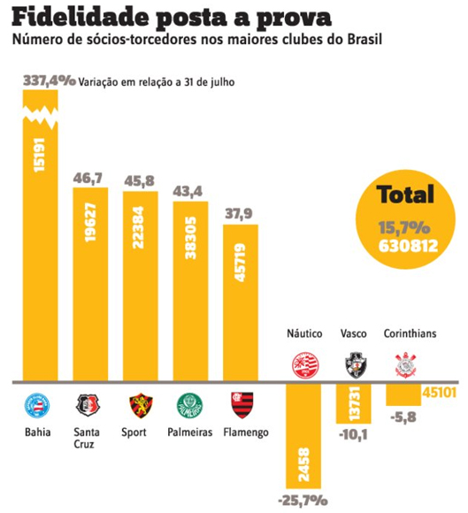 Por razões distintas, Flamengo e Bahia foram alguns dos clubes brasileiros que mais ampliaram os quadros de sócio-torcedor no terceiro trimestre deste ano (julho, agosto e setembro). O salto obtido pelo Rubro-Negro carioca, que ocupa hoje a quarta posição no ranking do “Movimento Por um Futebol Melhor” com 45.719 sócios, deve-se muito também aos gols do atacante Hernane.