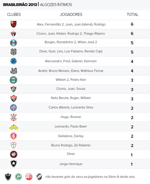 Torcedor tem suas manias e uma delas é a de achar que quando o seu time enfrenta um jogador que já passou pelo clube do coração, a chance de ele aprontar é de quase 100%. Com base nessa curiosidade que paira a mente de boa parte das pessoas fanáticas por futebol, o blog Numerólogos fez um levantamento dos jogadores que marcaram contra ex-clubes na edição deste ano do Campeonato Brasileiro da Série A. Flamengo e São Paulo lideram a ingrata disputa com seis gols cada de algozes íntimos.