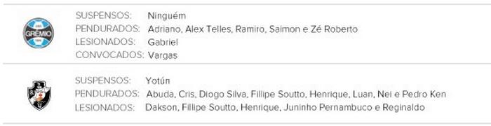 Confira os jogadores suspensos, pendurados e lesionados de Grêmio e Vasco