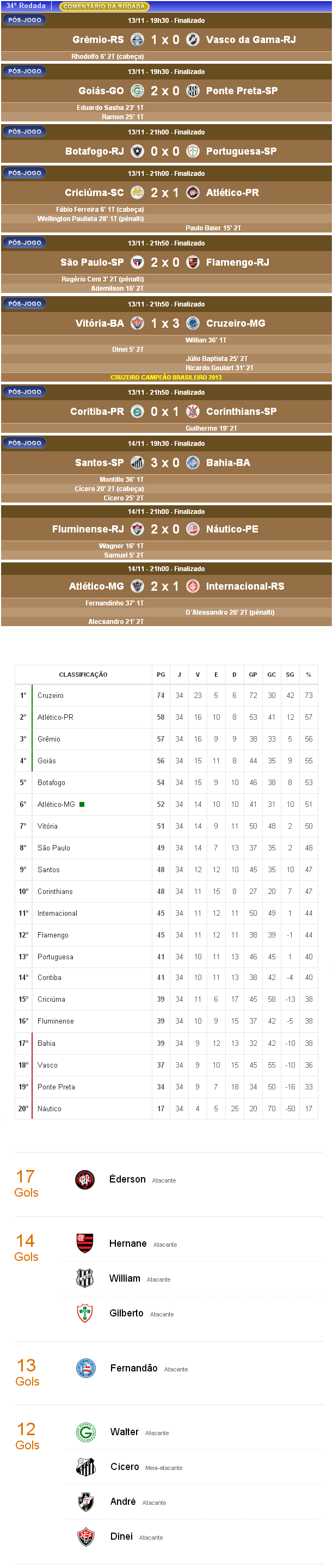 Terminada a 34ª rodada do Campeonato Brasileiro, a 15ª do returno, o Vasco, que perdeu para o Grêmio por 1 a 0, caiu da 16ª para a 18ª colocação na tabela, voltando a figurar na zona do rebaixamento. O Vasco está 2 pontos atrás do Fluminense, que é o primeiro time fora do Z4.