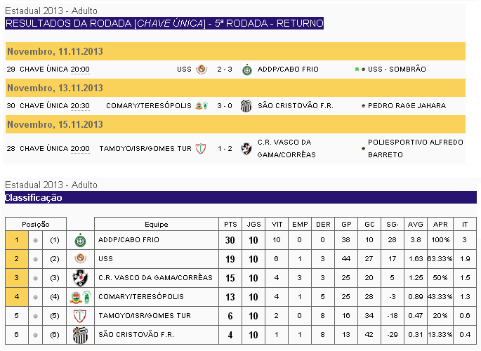 Já classificado às semifinais do Campeonato Estadual de Futsal, o Vasco derrotou o Tamoyo por 2 a 1 na noite desta 6ª-feira (15/11), em Cabo Frio, terminando a 1ª fase na 3ª colocação. O adversário do Gigante da Colina na luta por uma vaga na decisão será a USS, de Vassouras, 2ª colocada. A outra semifinal reunirá a ADDP/Cabo Frio, 1ª colocada, e o Comary/Teresópolis, 4º colocado. Tamoyo e São Cristóvão estão eliminados.