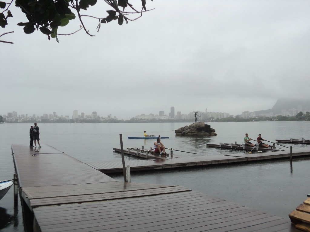 Confira na foto abaixo, sob a supervisão dos professores Carlos Henrique Martins e Bruno de França (à esquerda), atletas da escolinha realizando treinamentos nos novos simuladores de remo da nova rampa, em dia chuvoso:
