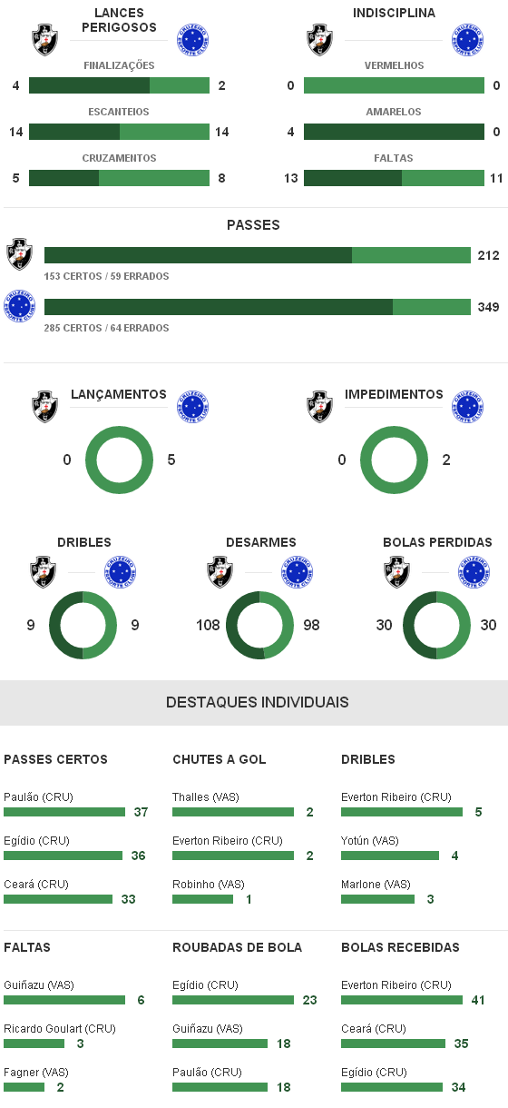 E a Raposa descontou aos 19 minutos, após cobrança de falta de Éverton Ribeiro, Paulão tentou desviar, mas não alcançou e a bola foi direto para as redes. Depois do gol, o Vasco recuou, inclusive colocando mais uma zagueiro no time, mas o Cruzeiro parecia estar mesmo em ritmo de férias e só teve mais uma chance de gol, com Julio Baptista, de fora da área.