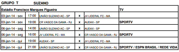 A Federação Paulista de Futebol divulgou a tabela da Copa São Paulo de Juniores, que será realizada de 3 a 25 de janeiro. O Vasco está no Grupo T com União Suzano-SP, Audax-SP e Lideral-MA. Confira os jogos do Gigante da Colina na 1ª fase: