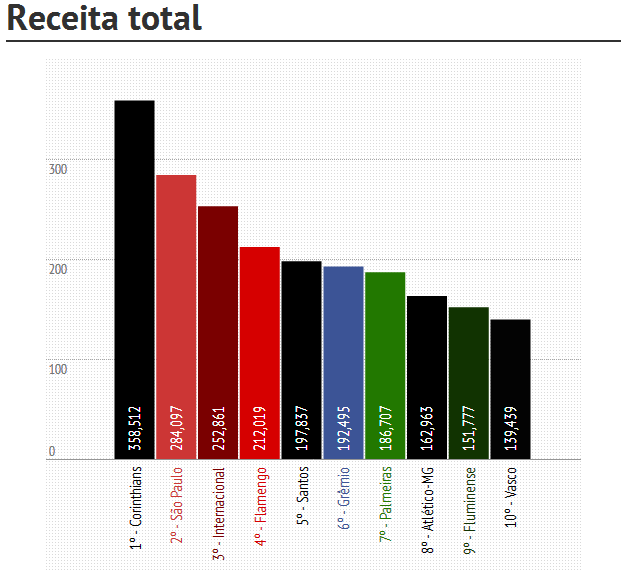 O Vasco arrecadou nas principais áreas pouco mais da metade do que o Palmeiras, que possui praticamente o mesmo número de torcedores. Seja em patrocínios e publicidade (R$ 26,9 milhões, contra R$ 44,2 milhões), em bilheteria (10,0, contra 18,4) ou no clube social e esportes amadores (14,0 a 22,9), o cruz-maltino carioca está bem atrás do alviverde paulista. A receita vascaína também é mais baixa do que equipes com torcidas menores, como Internacional, Grêmio, Santos e Fluminense.