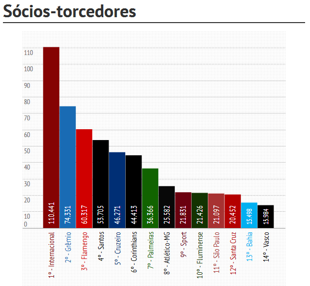 Na lista de sócios-torcedores, o Vasco está ainda mais embaixo. Aparece na 14ª posição, com cerca de 14 mil associados, o que representa apenas 13% dos 110 mil do líder Internacional, que tem a metade da torcida vascaína. O rival Fluminense e os pernambucanos Sport e Santa Cruz, estes dois últimos que sequer disputaram a Série A em 2013, superam a marca vascaína.