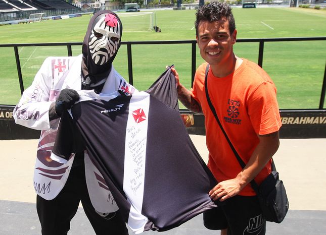 O apoiador Bernardo reencontrou nesta quarta-feira o torcedor que prestou uma homenagem a ele no último domingo, no Maracanã, e retribuiu o carinho com uma camisa autografada em São Januário.