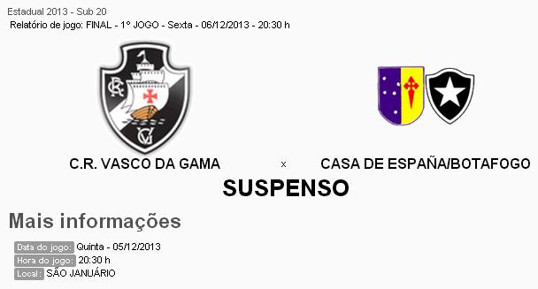 O jogo de ida da decisão do Estadual Sub-20, que aconteceria na noite desta 5ª-feira (05/12) em São Januário entre Vasco e Casa de España/Botafogo, foi suspenso. Apesar da noite ter sido de fortes chuvas no Rio de Janeiro, a não realização da partida nada teve haver com as condições meteorológicas. O TJD suspendeu o jogo até o julgamento de uma denúncia de que o Vasco teria inscrito dois jogadores fora do prazo.