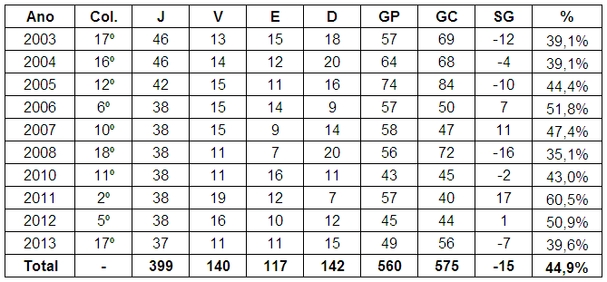 Até agora, em 399 partidas, o Gigante da Colina ganhou 140, empatou 117 e perdeu 142, tendo marcado 560 gols e sofrido 575.