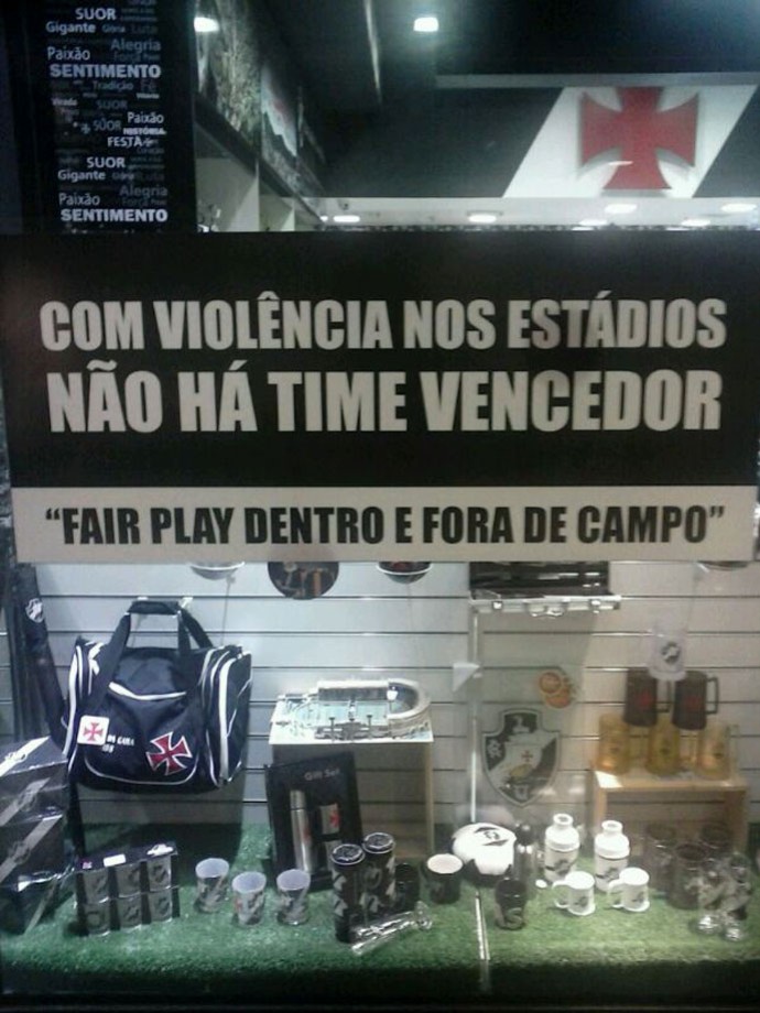 Depois das cenas brutais da briga entre torcedores de Atlético-PR e Vasco no último domingo, na Arena Joinville, uma loja oficial do Cruz-Maltino resolveu entrar na corrente pela paz nos estádios. A "Gigante da Colina" do shopping Nova América, na Zona Norte do Rio, exibe um cartaz com os dizeres: "Com violência nos estádios não há time vencedor. Fair play dentro e fora de campo".